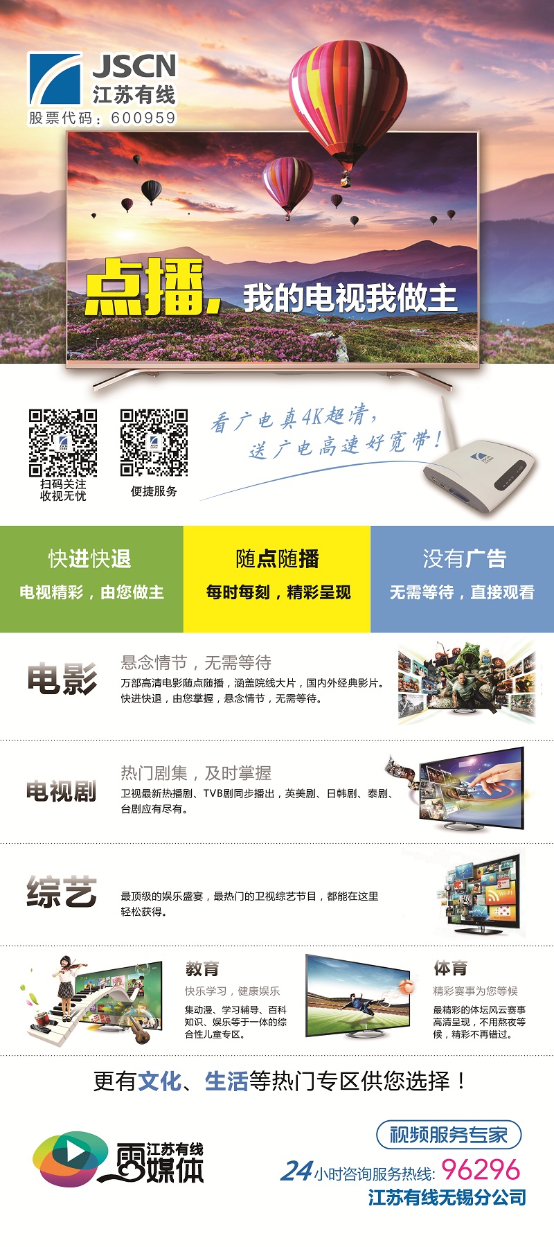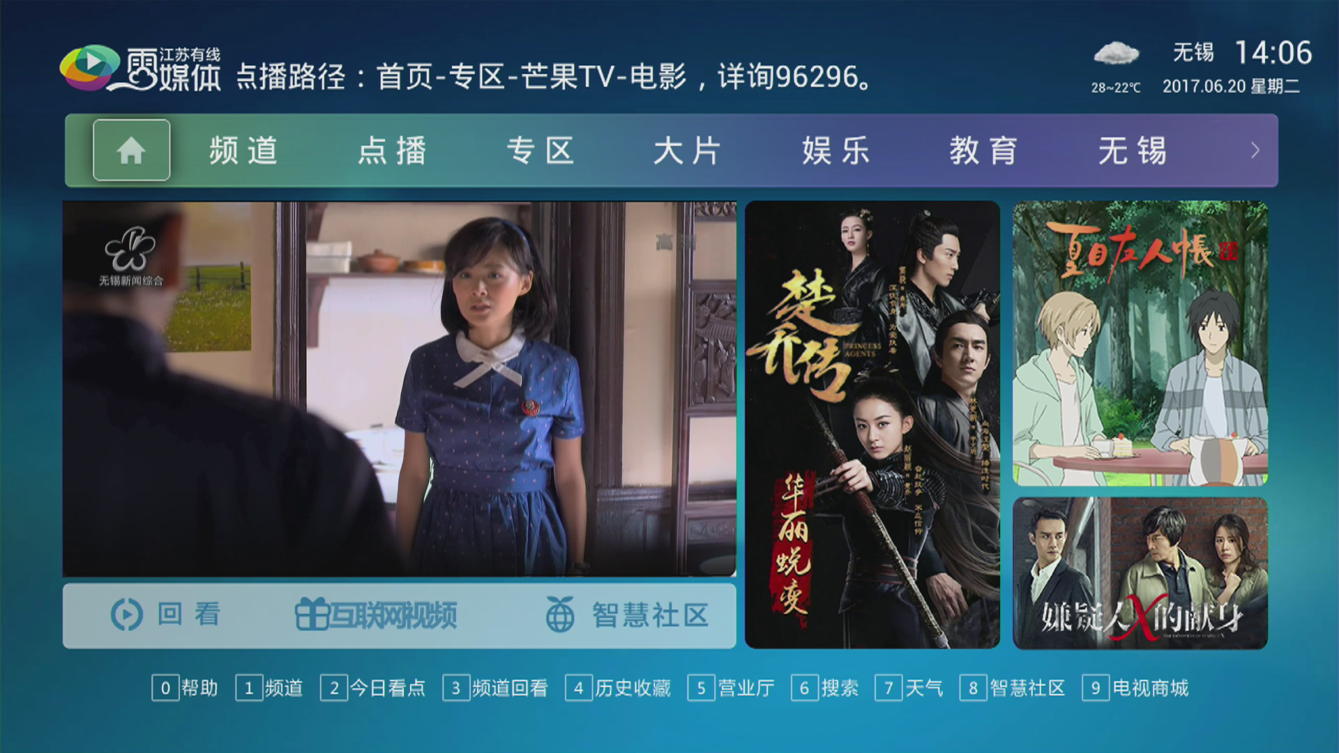 互動電視是江蘇廣電網絡無錫分公司為用戶提供的集合視頻點播、節目回看、資訊服務等一系列內容的高品質有線電視服務。互動電視打破了傳統的“你播我看”的電視收看方式,用戶可以通過點播、回看等功能實現與電視的互動。互動電視具備電視節目頻道更多,圖像質量更高,音質效果更好,收視方式更新,節目播放時間更長等諸多優勢,能為用戶創造更加自由、精彩的數字電視生活。